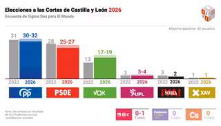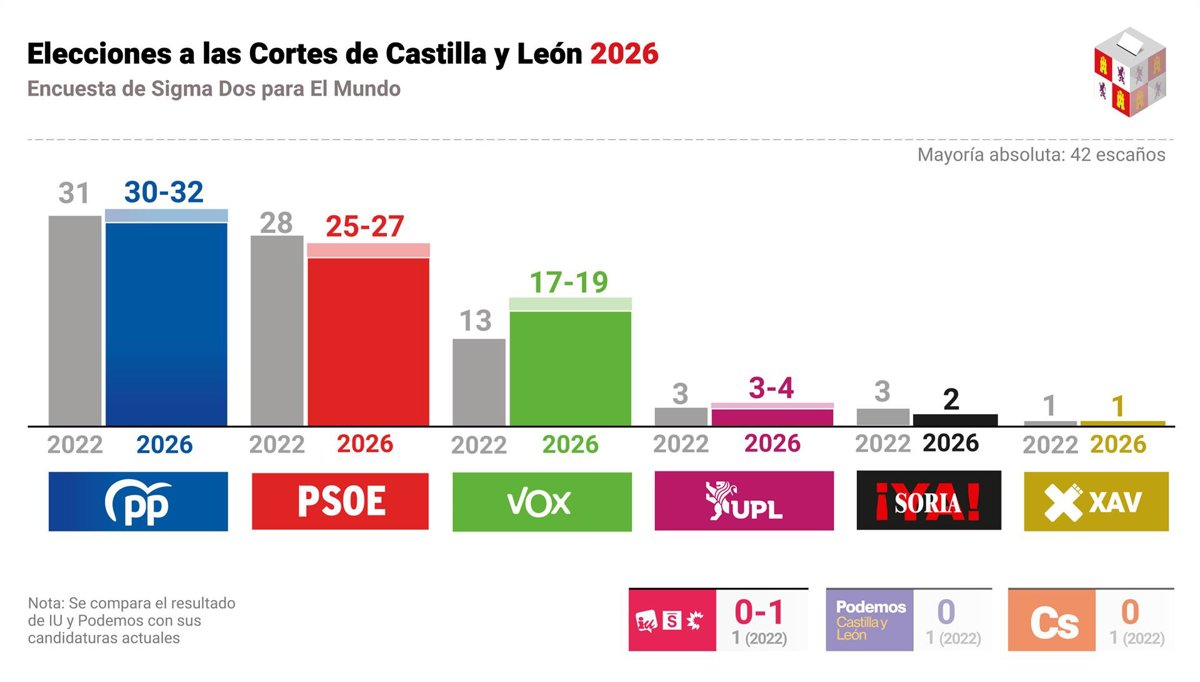 A pesquisa da Sigma para a CyLTV e o El Mundo aponta resultados nos quais o PP obteria entre os 31 assentos que possui atualmente e 35; enquanto o PSOE ficaria entre 26 e 28, que são os que possui neste momento, e o Vox entre 13 e 17.