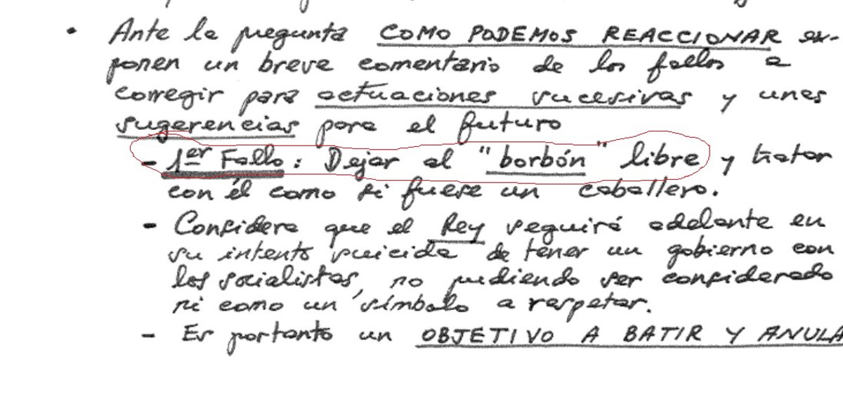 MADRID 25 fev. (EUROPA PRESS) - Em um documento encabeçado por “militares espanhóis”, são dadas algumas instruções para agir após o golpe de 23-F, no qual afirmam que o primeiro erro foi “deixar o Bourbon livre” e tratá-lo como um cavalheiro, pelo que consideram que ele se tornou um “alvo a ser derrotado e anulado”. Além disso, acrescentam uma série de recomendações para agir em “ações sucessivas”. O referido documento é manuscrito e faz parte dos documentos de planejamento do golpe de Estado que foram elaborados no final de 1980 e cuja desclassificação foi aprovada na terça-feira pelo Conselho de Ministros.