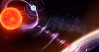 Uma equipe internacional de astrônomos demonstrou que uma anã branca e uma anã vermelha, que orbitam uma à outra a cada duas horas, emitem pulsos de rádio.