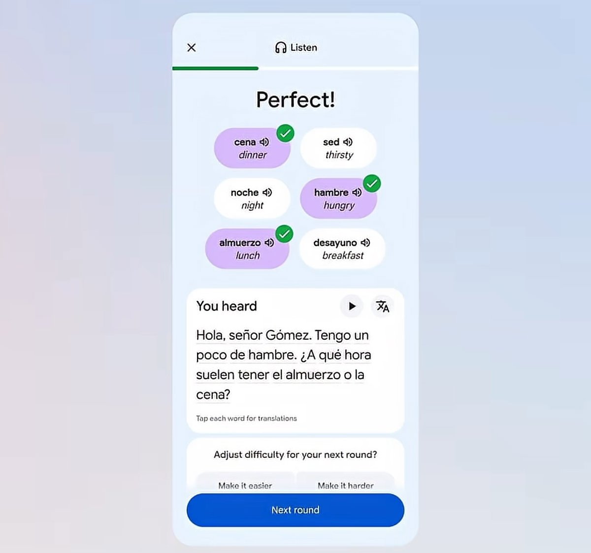 Especificamente, ao abrir o aplicativo em um dispositivo, você pode selecionar o idioma no qual deseja que as interações e explicações sejam mostradas, bem como selecionar três níveis do idioma que deseja praticar: básico, intermediário ou avançado, que podem ser alterados à medida que você progride.