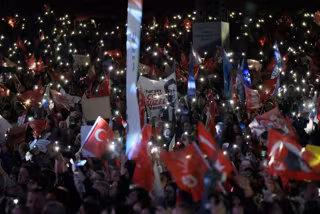 "Caros amigos, vocês sabem que estamos em uma grande luta. Nossa luta é pela democracia, pela liberdade", disse o líder do Partido Republicano do Povo (CHP), Ozgur Ozel, em pé em um ônibus em frente aos manifestantes.