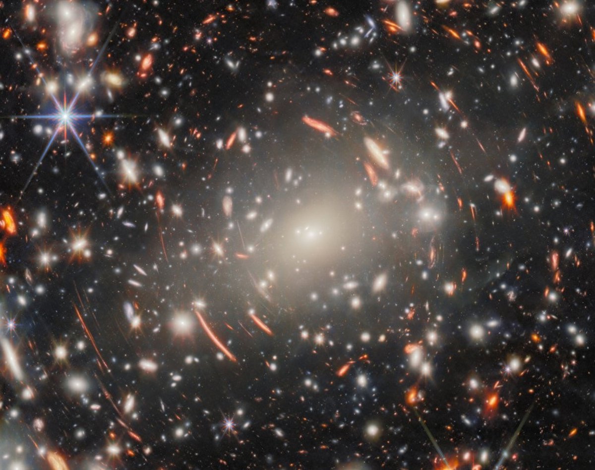 Novas imagens da câmera de infravermelho próximo do Webb (NIRCam) levam essa busca ainda mais longe no tempo. Essa imagem mostra uma incrível floresta de arcos de lentes ao redor de Abell S1063, revelando galáxias de fundo distorcidas em várias distâncias cósmicas, juntamente com uma infinidade de galáxias fracas e características nunca vistas antes.